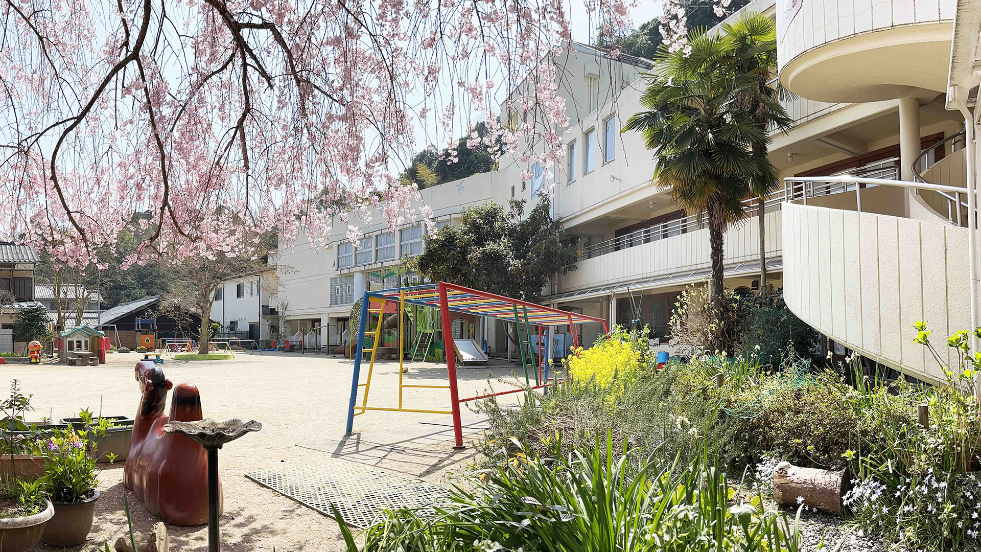 園庭をぐるっと囲むように桜やバラ、紫陽花やパンジーなど様々な草花が植えられ、毎月順番に花が咲き、鳥や虫が集まってきます。