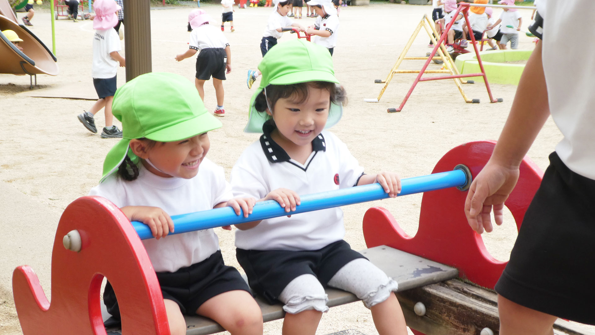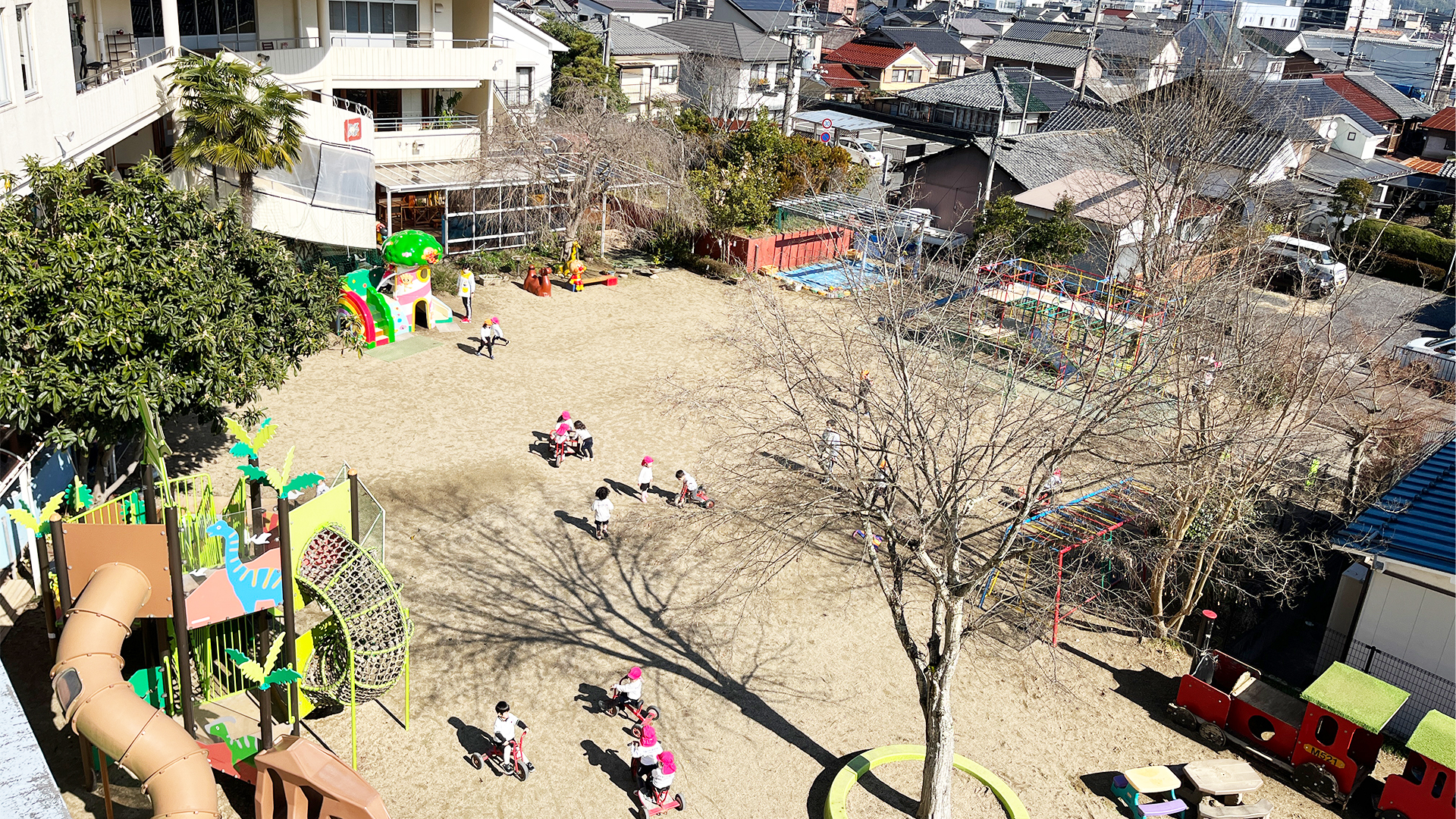 子どもたちの毎日をドキドキ、ワクワクの楽しい時間にするため、広い園庭に沢山の遊具で想像力を描きたてる空間を創造しています。