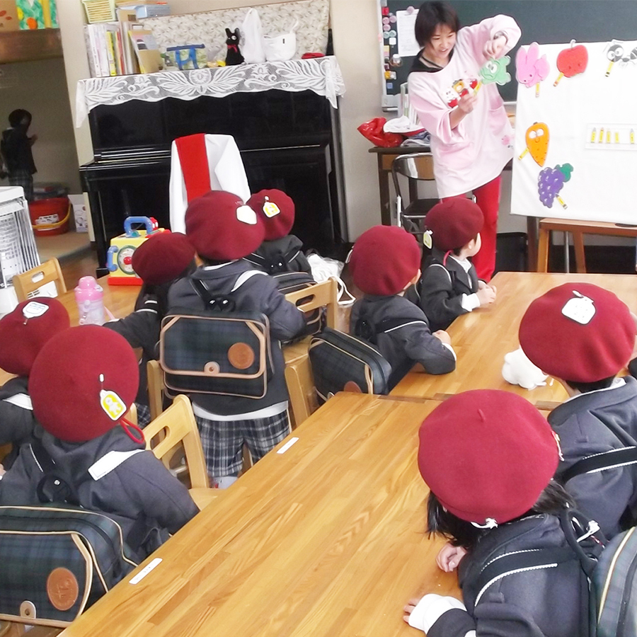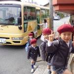 | 登園 | 7:30~9:30 (7:30~8:30は早朝保育) | 徒歩通園、バス通園、順次登園してきます。 幼稚園バスに描かれているのは『大きなカブ』のお話。その中には、幼稚園の制服を着たお友達も一緒に引っ張っていますよ。 | ![]() |