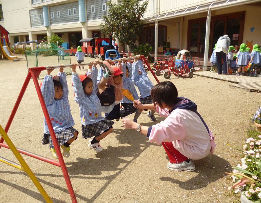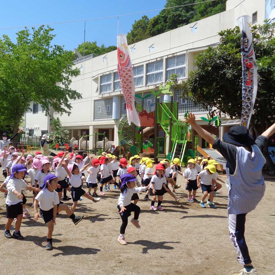 | 一斉保育・設定保育 | 10:00~11:40 | 全学年合同の一斉保育、そして各学年又はクラスごとの設定保育を行います。 運動遊び、制作遊び、リトミック等、幼稚園は楽しい子ども達の声に包まれます。 体操教室、サッカー教室、英語教室(年長のみ)もありますよ。 | ![]() |